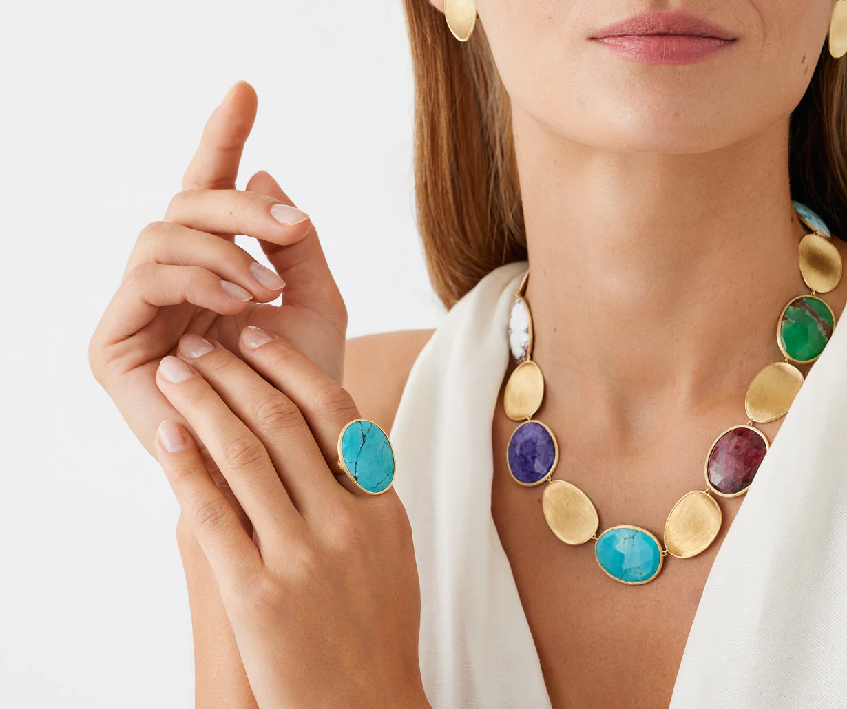 Anello cocktail dal design elegante e dalla superficie irregolare, impreziosito da turchese messicano. Realizzato in oro giallo 18 carati, è finemente inciso a mano secondo l’antica tecnica fiorentina, che gli conferisce una straordinaria eleganza e una superficie setosa.