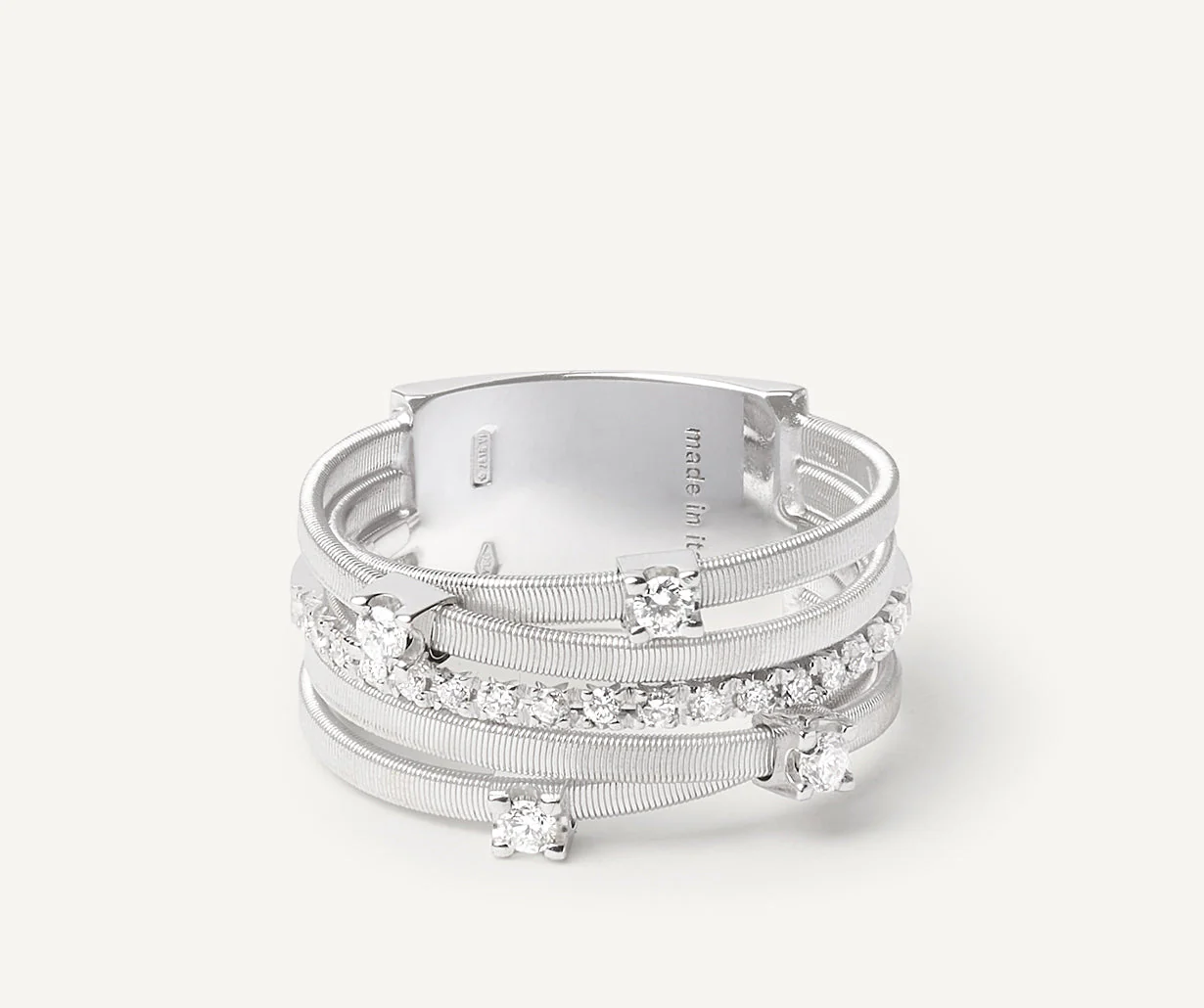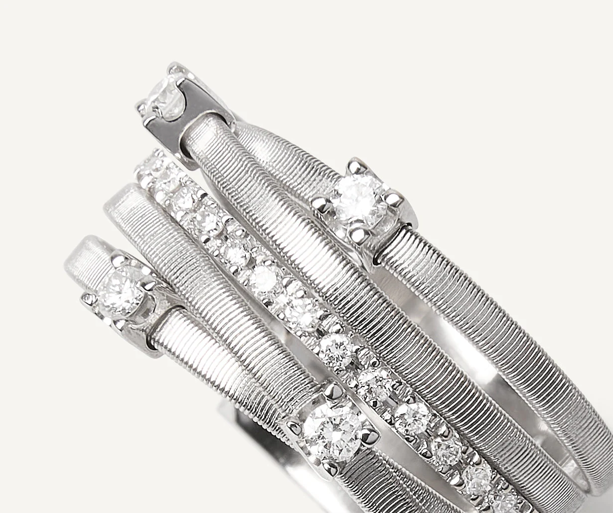 Questo sofisticato anello in oro bianco 18 carati è impreziosito da una barretta di diamanti intrecciata con fili piatti a spirale, realizzati con cura con l’esclusiva tecnica della spirale. Quattro diamanti incastonati a griffe incorniciano i profili esterni, per un tocco di brillantezza in più.