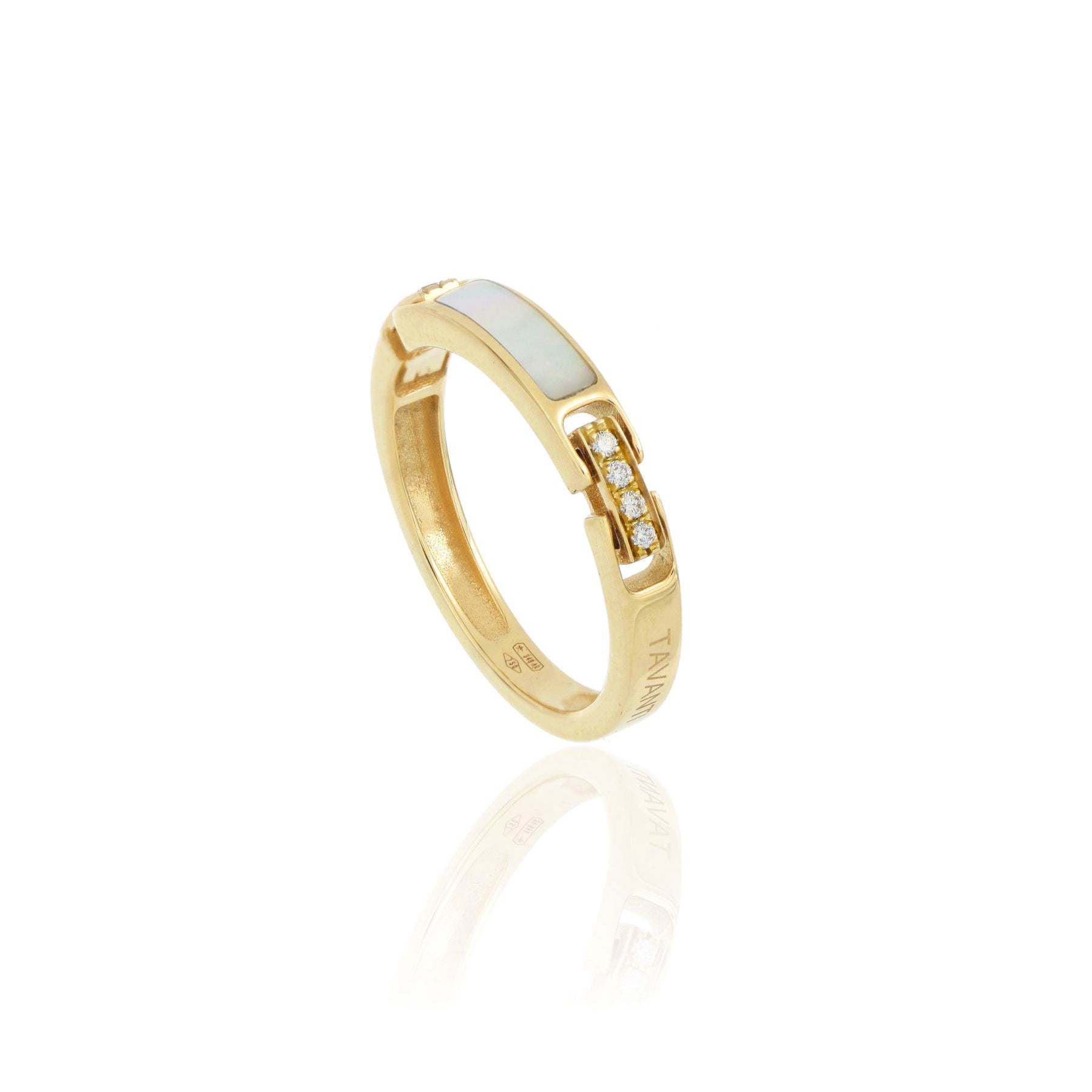 Il calore dell’oro e la luminosità  delle pietre naturali, un elegante gioco di forme e colori che danno vita a questo anello in oro giallo 18 kt caratterizzato un elemento centrale reso unico dal colore delicato della madreperla bianca unita al fascino dei diamanti. Un gioiello dal design lineare e curato nei minimi dettagli, indossabile in ogni occasione.