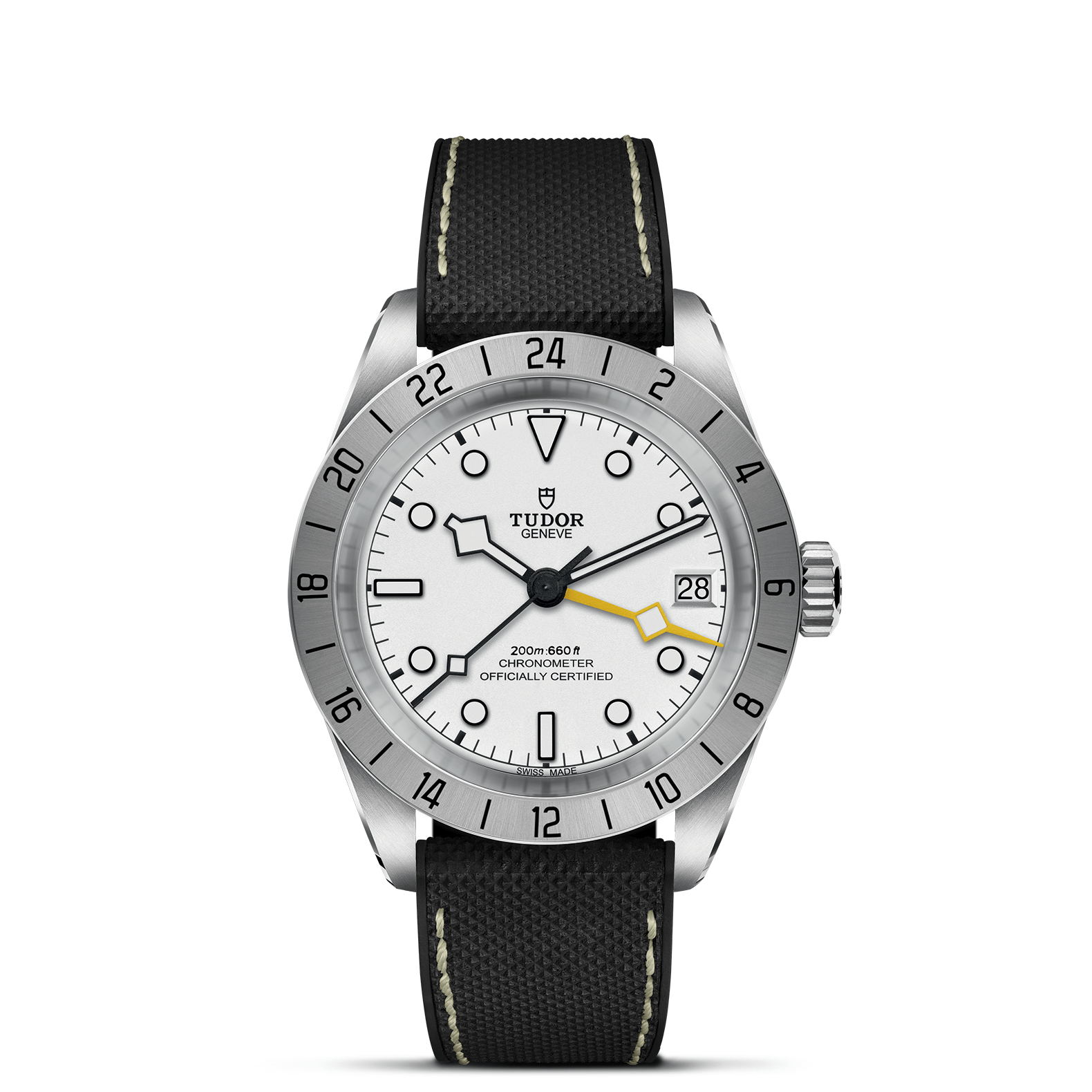 Il Black Bay Pro è un modello interamente nuovo dotato di doppio fuso orario, una complicazione tecnica che permette di visualizzare l’ora locale senza perdere di vista l’ora di un altro fuso orario. Compatto, robusto e sportivo, questo modello presenta numerosi dettagli estetici unici e celebra lo spirito degli orologi tecnici che TUDOR ha prodotto per i professionisti nel corso della sua storia. Riconoscibile grazie alla lunetta fissa satinata graduata 24 ore e alla lancetta “Snowflake” 24 ore di colore giallo, il Black Bay Pro è animato dal Calibro di Manifattura TUDOR MT5652 con funzione GMT integrata.