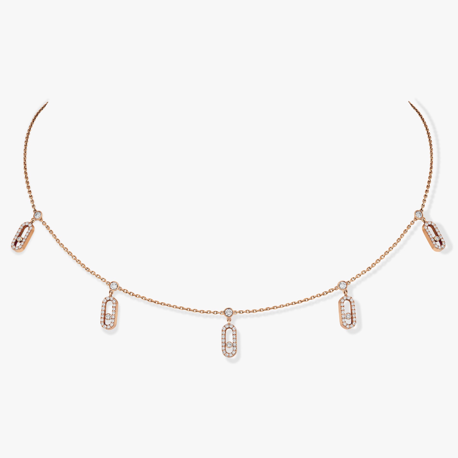 L’ultima arrivata della collezione Move, la collana con catena con nappe in oro rosa e diamanti. In un’estetica bohémien chic, gli artigiani della casa hanno ornato una catena in oro rosa con 5 scintillanti diamanti all’estremità della quale troviamo, come 5 gocce preziose, 5 pendenti Move Uno tutti ingioiellati e articolati. Questa collana di diamanti Move Uno è dotata di un sistema di catena scorrevole che ti permetterà di indossarla come girocollo, o al collo, come desideri. Una collana di lusso libera come te!