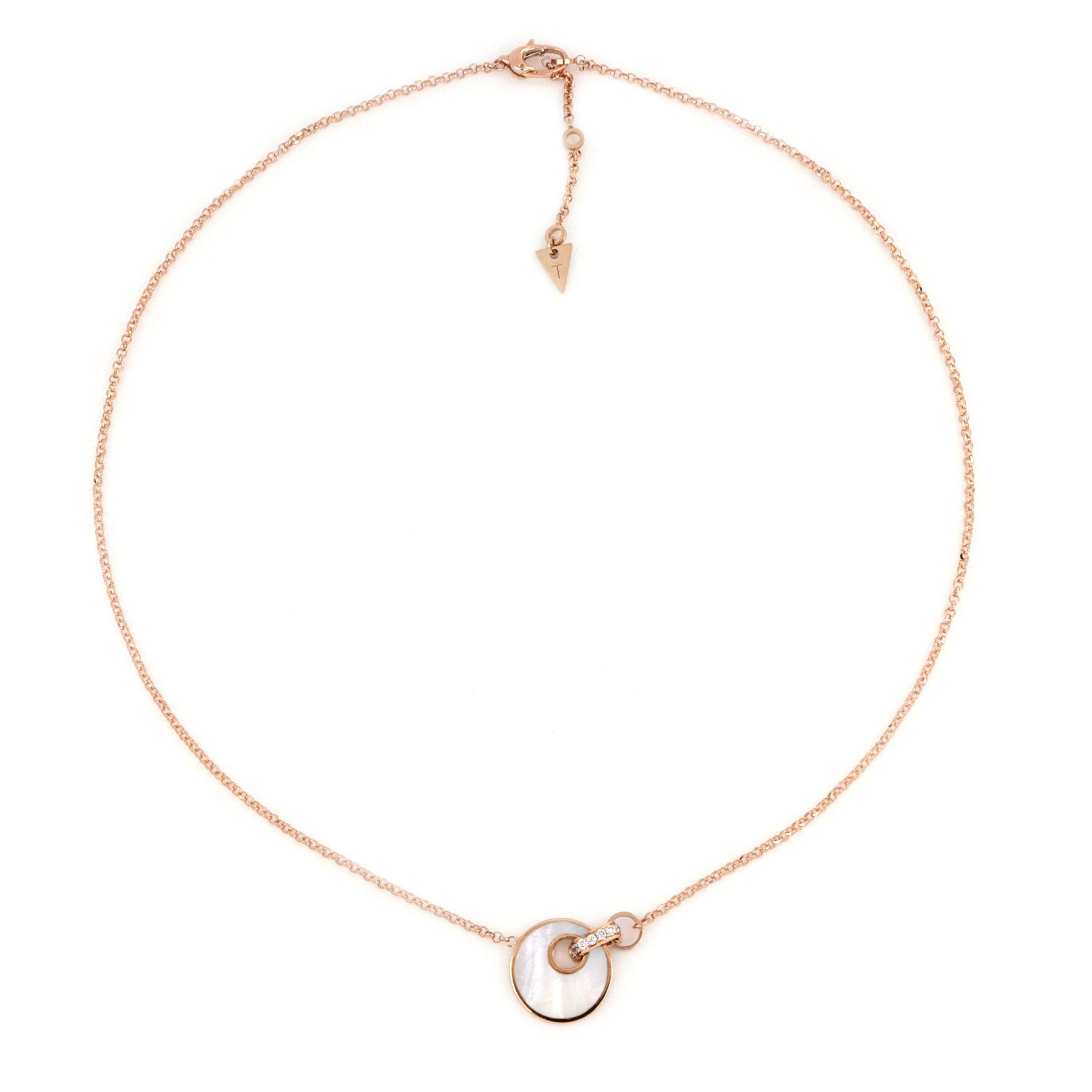 Questa collana in oro rosa è un gioiello dal design innovativo e divertente. Un tocco di irriverente creatività unisce l’oro 18 kt con un pendente in madreperla, impreziosito da un pavè di diamanti.