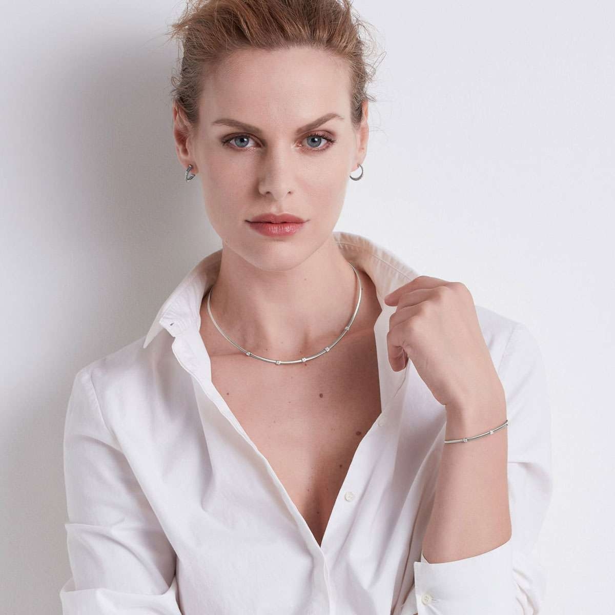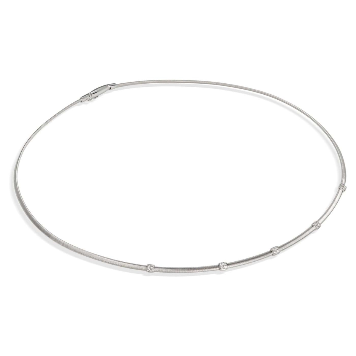 La collezione di gioielli Masai si ispira alla tribù africana da cui prende il nome. Questa collana è stata creata in oro bianco 18 carati e diamanti (0,15 ct totali). Una collana creata a mano con la firma unica di Marco con la tecnica della “corda di chitarra”. Una collana che gioca con il contrasto delle sfumature di oro e diamanti. Lunghezza totale 42 cm. Ogni pezzo si adatta alle curve del corpo permettendo agli stili di essere indossati da soli o con più pezzi.