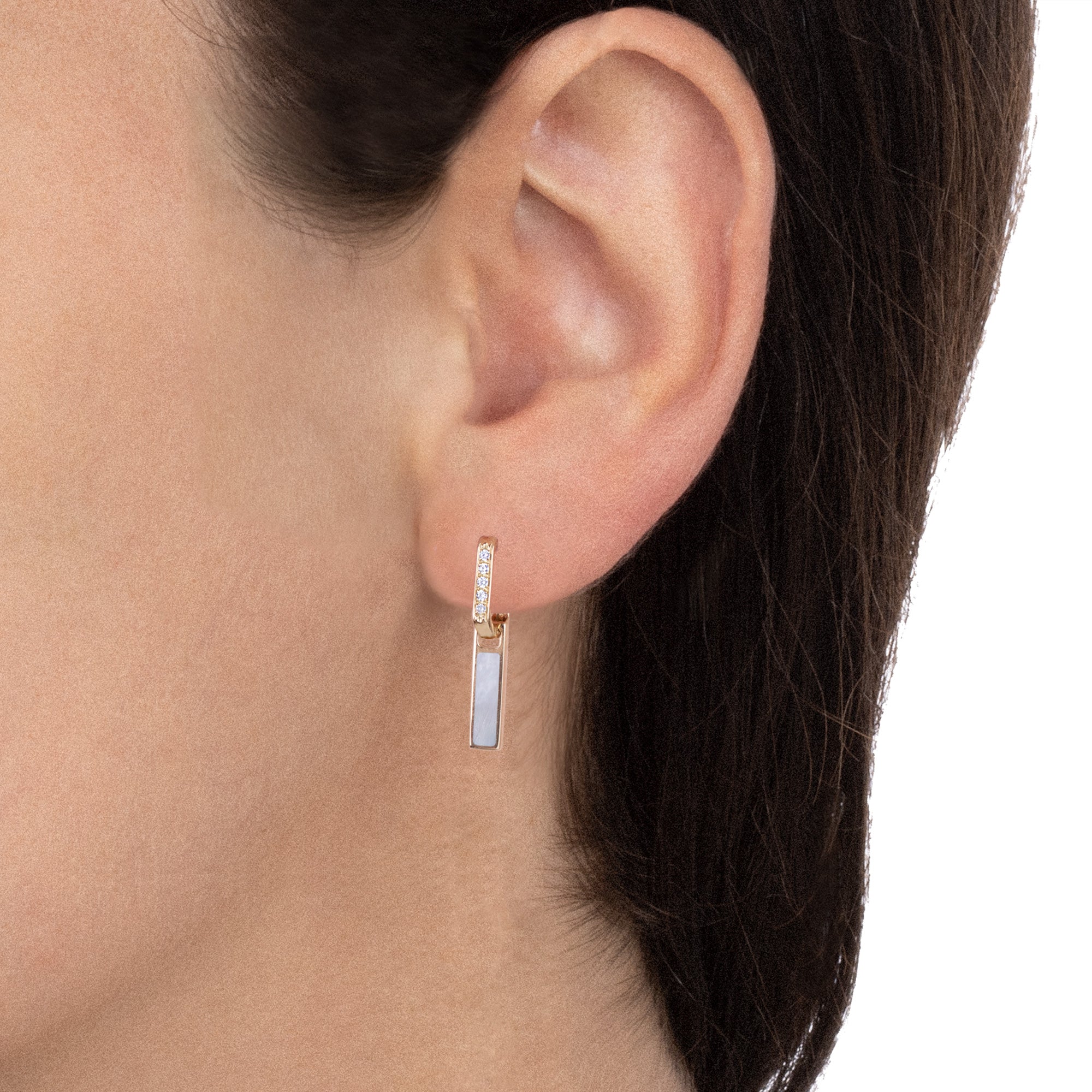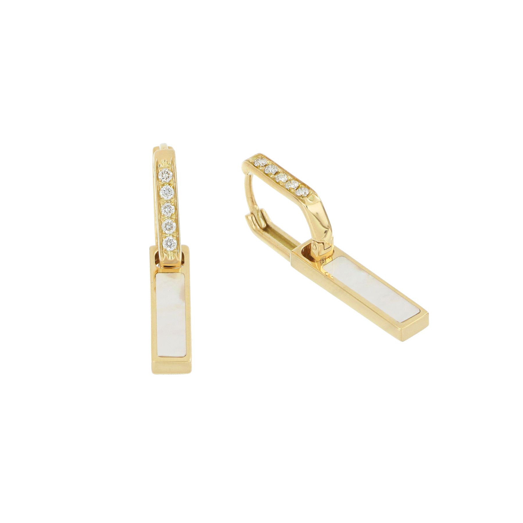Il calore dell’oro e la luminosità  delle pietre naturali, un elegante gioco di forme e colori che danno vita a questi orecchini in oro giallo 18 kt caratterizzati da un pendente rettangolare reso unico dal colore delicato della madreperla bianca unita al fascino dei diamanti. Un gioiello dal design lineare e curato nei minimi dettagli, indossabile in ogni occasione.